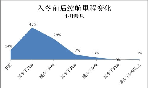 若在行驶过程中启动暖风功能,那么续航里程下降的幅度更大。近七成的车主选择了减少20%-30%。可见,除了低温给车辆续航带来的影响,暖风功能造成的“自我消耗”使车辆的续航表现雪上加霜。如果以这种续航能里,纯电动车在冬季,只能满足城市单程80km左右的出行需求,还是要在目的地有充电条件的情况下。否则,出行距离只能减半。有一位车主选择了开暖风情况下续航不变,这位车主,您是点错了呢还是点错了呢?