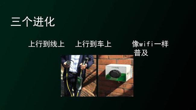 邵丹薇力陈当前产业四大弊端——待机电损高、维护成本高、投资成本大、用户体验差,并针对性的提出以移动充电桩、移动储能充电和移动救援储能车三个技术分化来改善这些问题。其中移动充电桩方案将经过三个进化:充电桩做在线上→充电桩做到车上→充电插座可以像WiFi一样地普及。