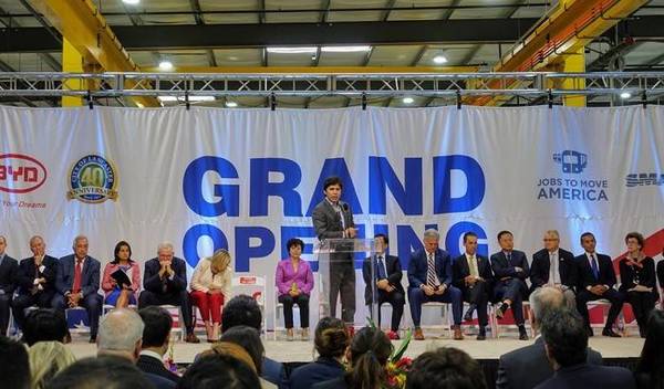 10月6日,位于南加州兰卡斯特市的比亚迪电动大巴工厂举行三期工程扩建竣工仪式。孙鲁山代总领事和刘海彦商务参赞应邀出席。新建成的电动大巴工厂占地约4.1万平方米,是美国首家中国独资大巴工厂,也是北美地区最大的电动大巴工厂。美国国会议员、加州参议院议长、洛杉矶郡长以及兰卡斯特市长等20多位政要共同出席竣工仪式,体现出比亚迪秉持的清洁能源理念获得美国主流社会认可,中企投资美国带来了双方的互利共赢。