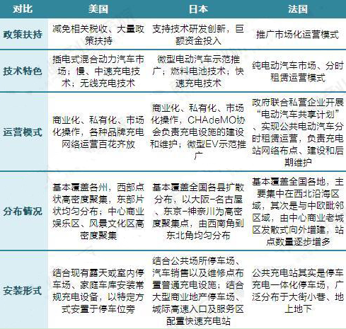 在国家政策方面,美国主要的是以减免税收和政策扶持为主;日本已巨额资金投入、支持技术研发创新为主;而法国则是以推广市场化运营模式为主,例如通过推动电动汽车租赁Autolib项目带动充电桩建设。