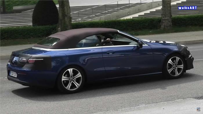 整车呈现在眼前还是比较精美的,深蓝色车身搭配深褐色的软顶敞篷,大部分车身都没有伪装,E级coupe车型会在未来几周之内亮相,新的敞篷版亮相日期也不会太远了。