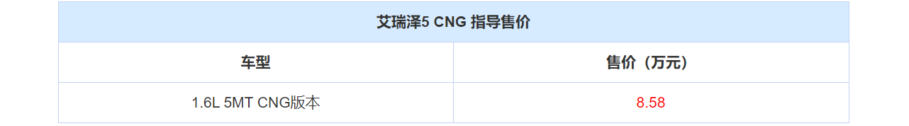 据汽车之家报道,奇瑞艾瑞泽5 CNG车型上市,售价为8.58万元。除了动力系统之外,该车在部分细节以及配置部分也有调整。