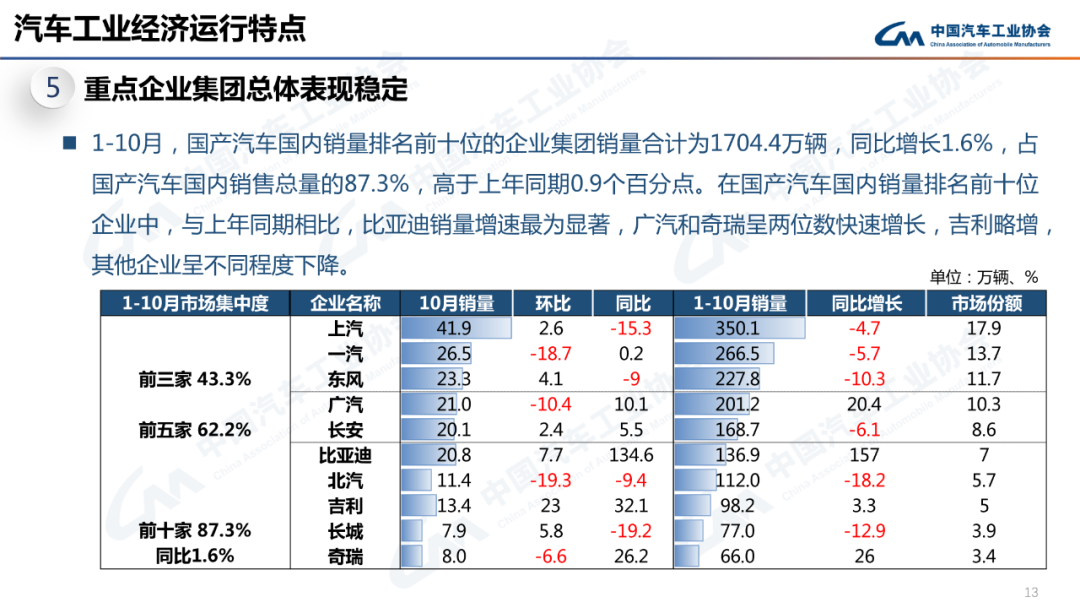 10月,中国品牌乘用车销量为118.7万辆,同比增长23.5%,市场份额为53.2%,上升5.5个百分点。1-10月,中国品牌乘用车销量为935万辆,同比增长26.1%,市场份额:48.7%,上升4.8个百分点。