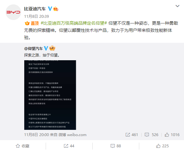 11月8日,比亚迪官宣旗下百万级高端品牌定名仰望。据悉,新品牌将于2023年第一季度推出,旗下车辆定位在80万至150万元之间,且其品牌、产品、销售服务网络、运营团队等均会独立运作,首款车型将是一款定价百万级的越野车。