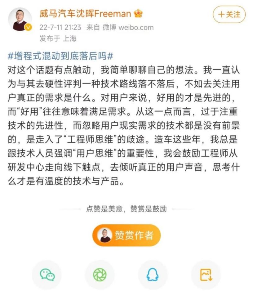 但争论并未停息。“增程式可油可电,是目前最合适的新能源模式。”2022年7月6日,华为与赛力斯合作的增程式车型——AITO问界M7上市,该款车也采用增程式混动技术。华为智能汽车解决方案BU CEO余承东特意发了微博,顺手在微博上CUE了一下李想,似乎在感谢他为开拓探索增程式作出的贡献。