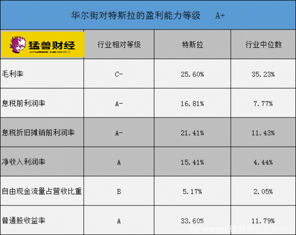 在盈利能力方面,特斯拉被华尔街评为A+,而且其盈利指标也远远超过同行的中位数。特别是特斯拉的普通股收益率已经达到了33.6%,比同行高出了185%。
