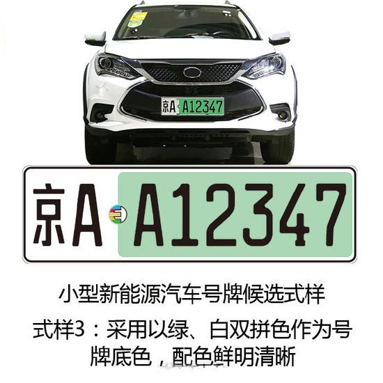 目前,新能源号牌设计方案已经公布,小型车和大型车各3种式样。新能源汽车号牌配色以绿色、黄色和白色为主,整体设计为浅底黑字,外廓尺寸统一为480mm×140mm。其中,小型新能源汽车号牌以绿色和白色为底色,大型新能源汽车号牌以黄色和绿色为底色。